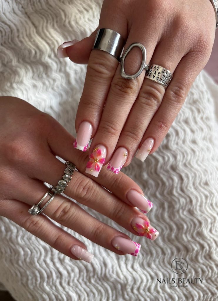 La prestation comprend une manucure russe, une construction en gel sans limage et une pose personnalisée avec nail art, bijoux et décorations.